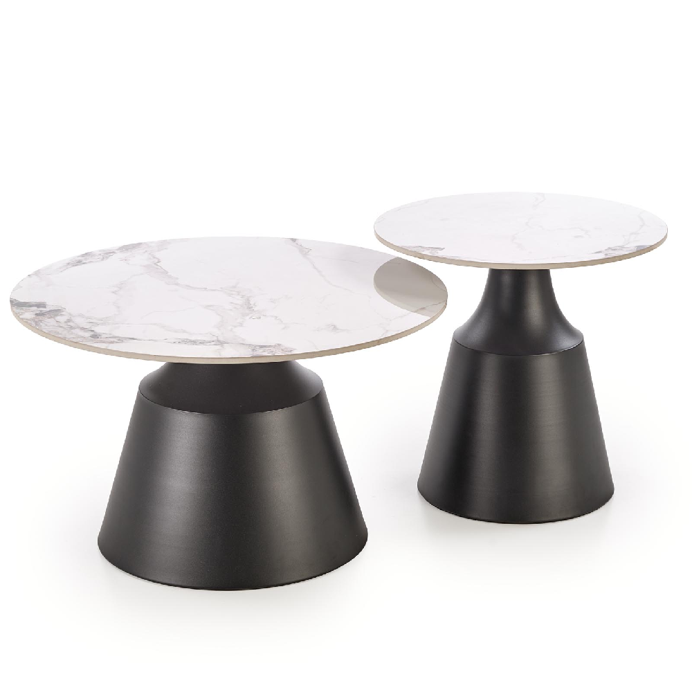 A MAGNETA lerakóasztal szett stabil fekete fém lábakkal, világos márványhatású színterezett kő asztallapokkal. Stílusos és praktikus választás szállodák, apartmanok vagy más szálláshelyek számára. Elegáns, letisztult megjelenésével könnyedén beleillik bármilyen enteriőrbe. A fekete fém lábak stabil alapot biztosítanak, míg a világos színű márvány hatású kő asztallap modern, luxus érzetet kelt.
