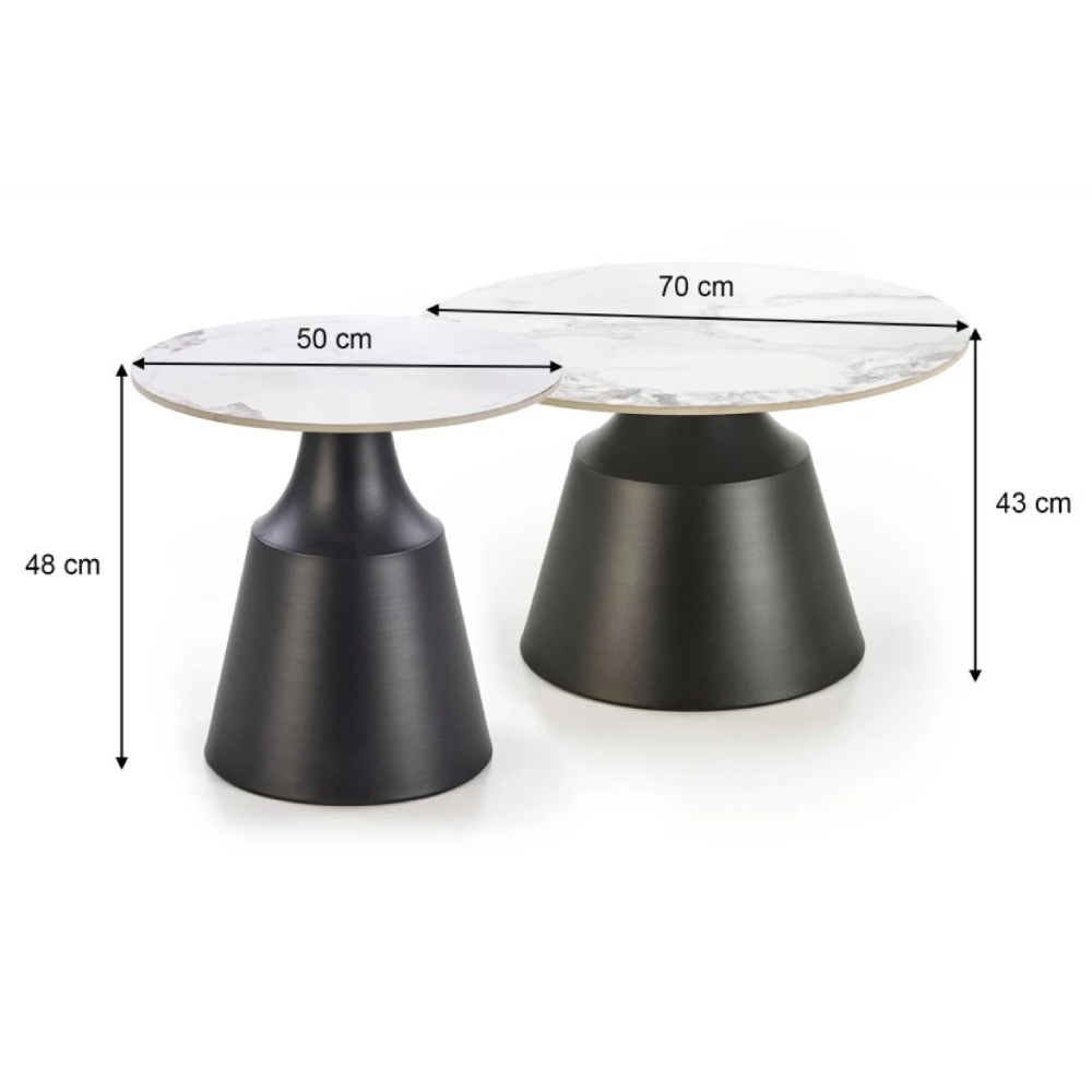 Méretei: Nagy asztal: 70 x 43 cm, kis asztal: 50 x 48 cm. (átmérő x magasság)