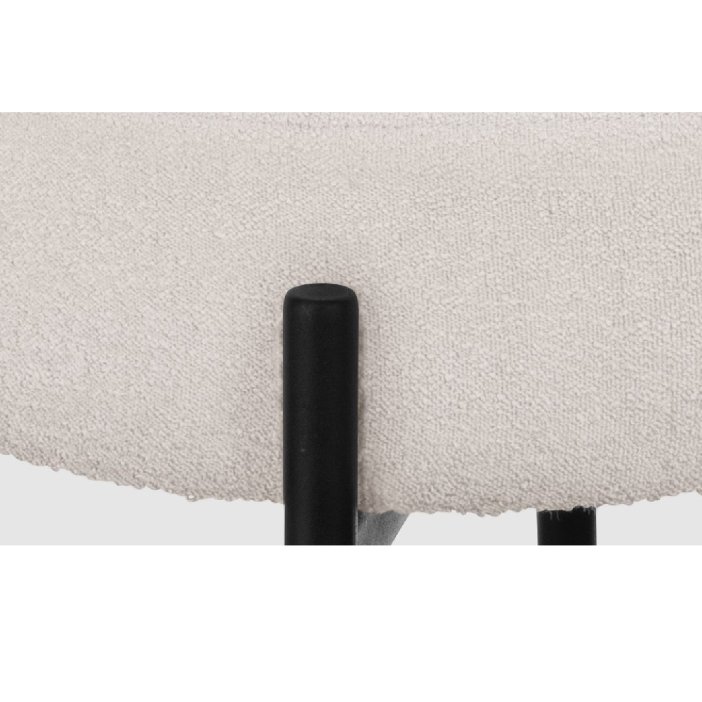 A szék ülőfelülete és háttámlája 100% poliészter boucle szövetből készült, amely nemcsak elegáns, hanem tartós és könnyen tisztítható is. Ez különösen előnyös a mindennapi használat során, ahol a bútoroknak intenzív igénybevételt kell kibírniuk. A fekete fém lábak modern megjelenést kölcsönöznek a széknek, miközben stabil és megbízható alapot nyújtanak.