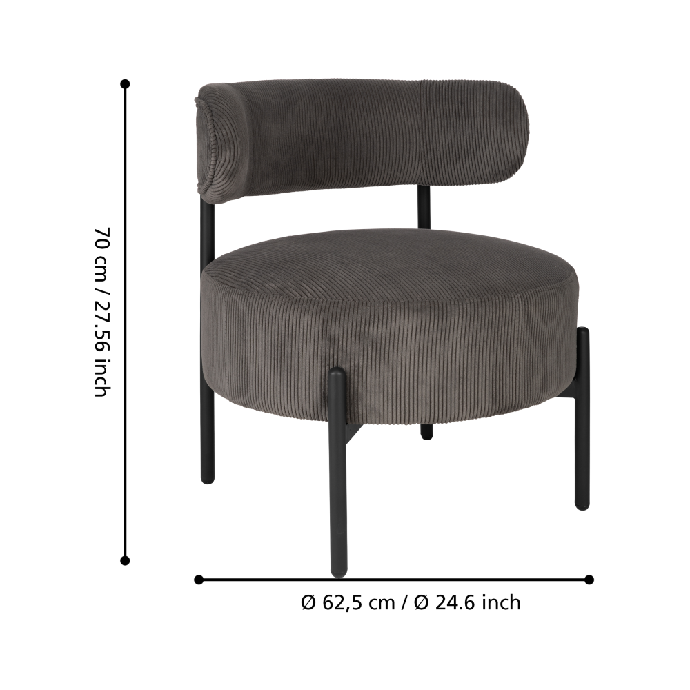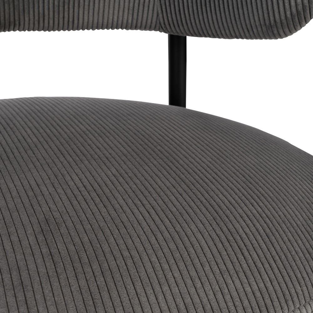 A fotel ülőfelülete és háttámlája 100% poliészter kordbársony szövetből készült, amely nemcsak elegáns, hanem tartós és könnyen tisztítható is. Ez különösen előnyös a mindennapi használat során, ahol a bútoroknak intenzív igénybevételt kell kibírniuk. A fekete fém lábak modern megjelenést kölcsönöznek a fotelnek, miközben stabil és megbízható alapot nyújtanak.