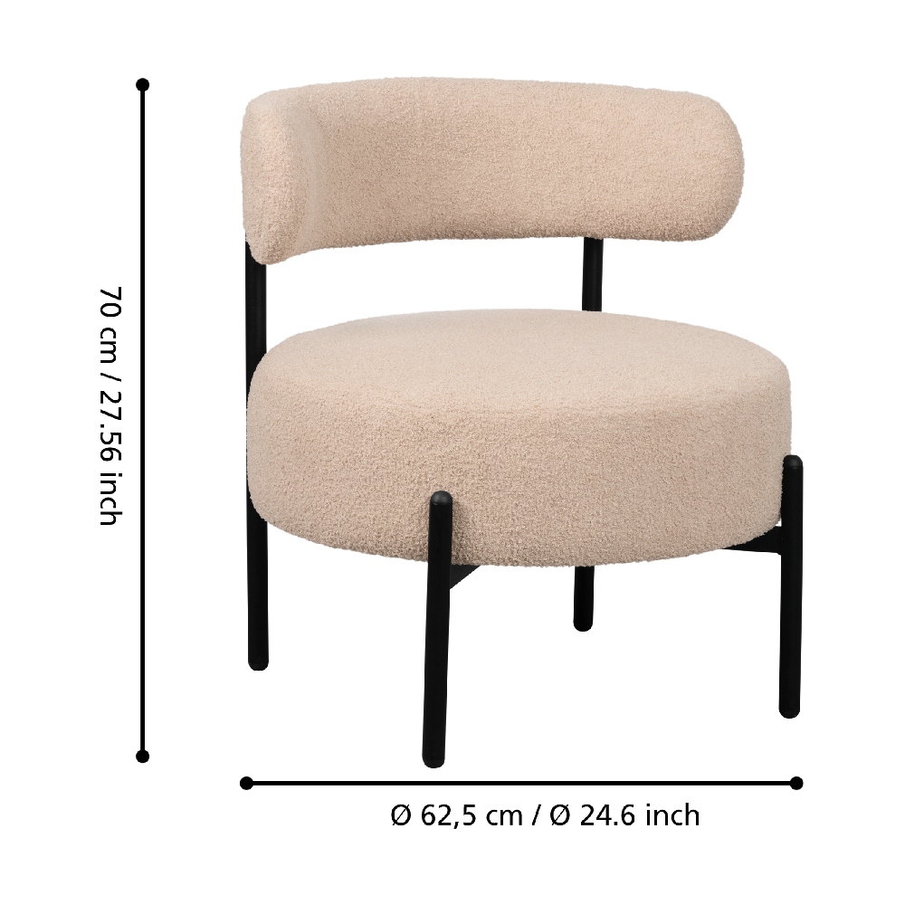 A fotel ülőfelülete és háttámlája 100% poliészter teddy szövetből készült, amely nemcsak elegáns, hanem tartós és könnyen tisztítható is. Ez különösen előnyös a mindennapi használat során, ahol a bútoroknak intenzív igénybevételt kell kibírniuk. A fekete fém lábak modern megjelenést kölcsönöznek a fotelnek, miközben stabil és megbízható alapot nyújtanak.