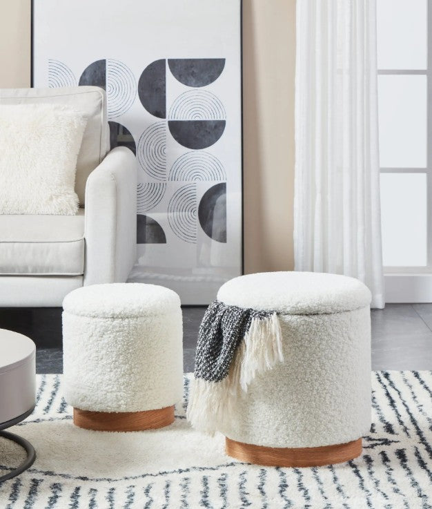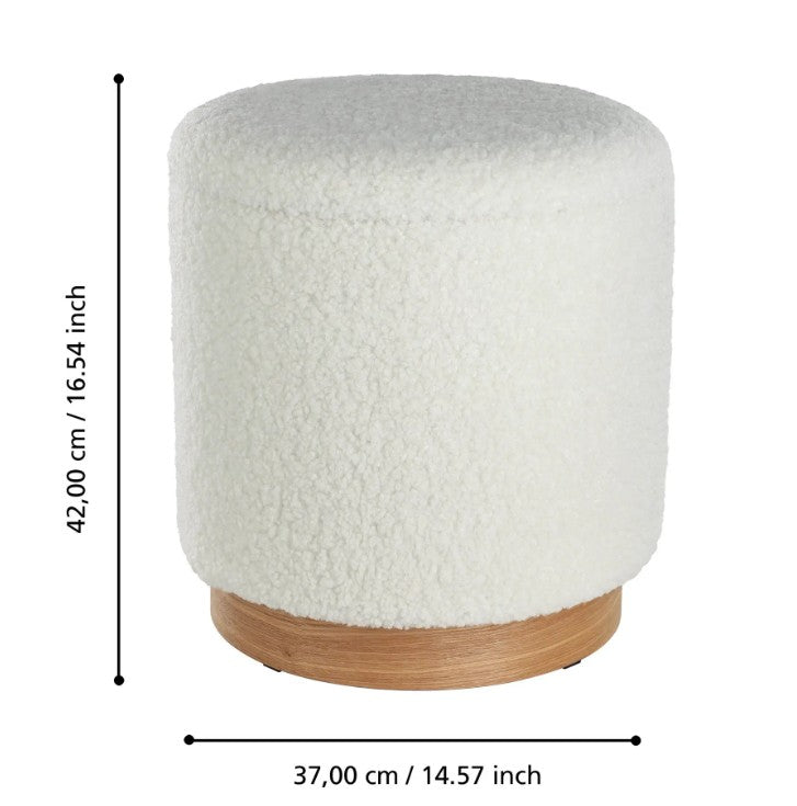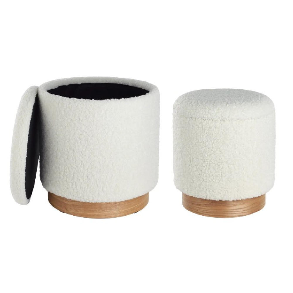A MASHIKE Teddy fehér, fedeles ülőke szett modern megjelenésével és tartós kialakításával kiváló választás szállodák, apartmanok és egyéb vendéglátóhelyek számára .A puha, fehér teddy szövet különösen kellemes tapintást biztosít, és otthonos hangsúlyt ad a térnek. A világos, kerek fa vázzal együtt harmonikus skandináv megjelenést kölcsönöznek, amely könnyedén illeszkedik különböző lakberendezési stílusokhoz. Az ülőfelület 100%-ban poliészterből készült, amely strapabíró és könnyen tisztítható, ideális a mindennapos használathoz. A fehér szín letisztult eleganciát kölcsönöz az ülőkéknek, melyek harmonikusan illeszkedik bármilyen belső térhez. Fedele levehető, így az ülőke tárolóként is használható.