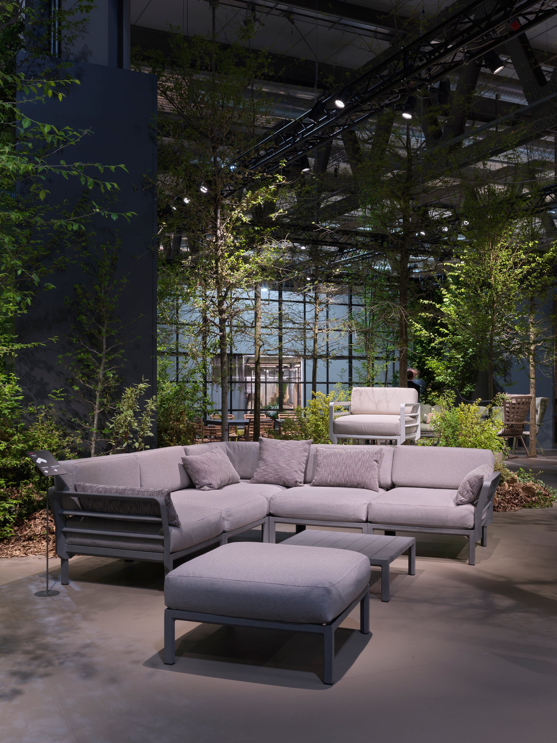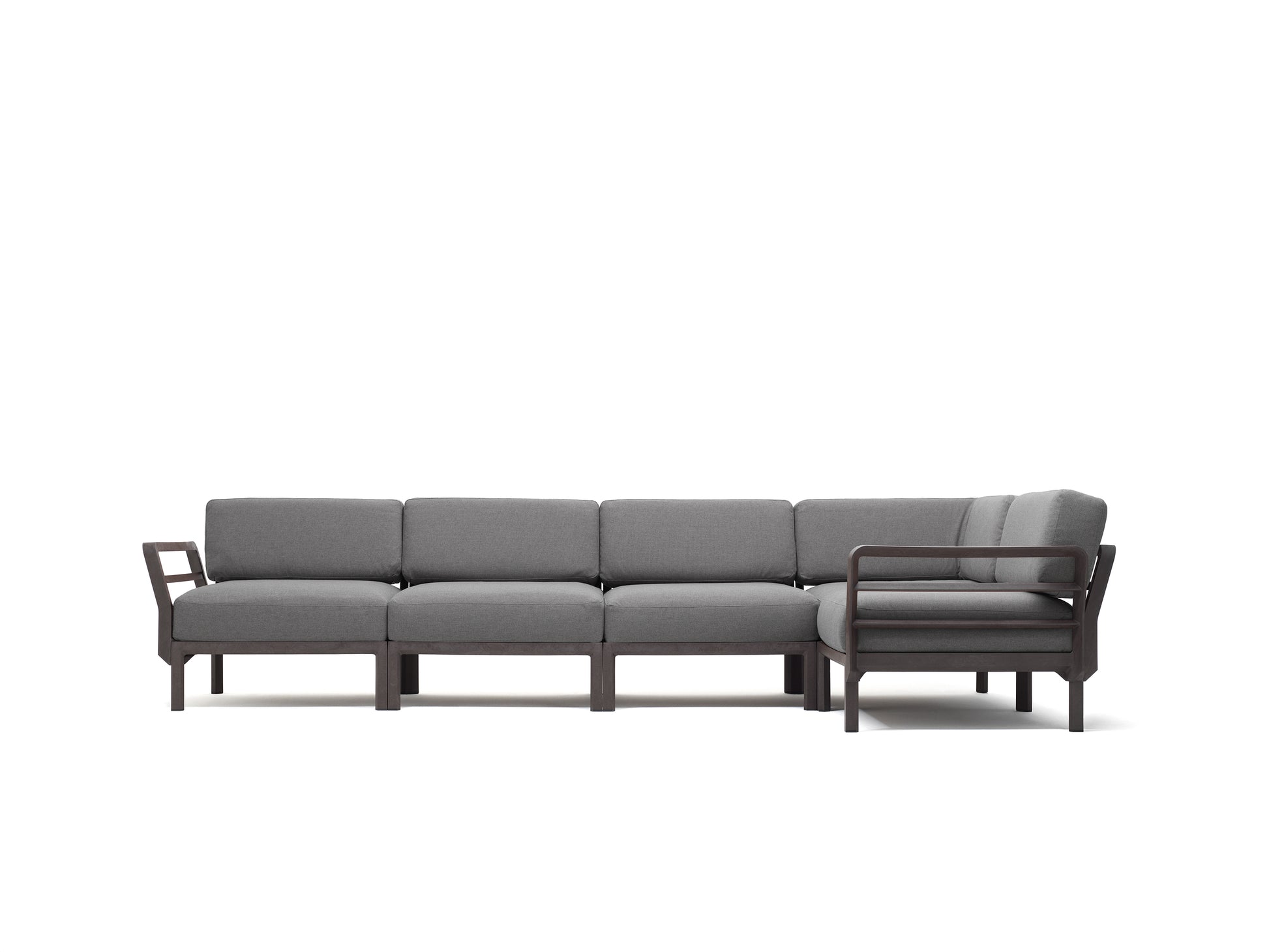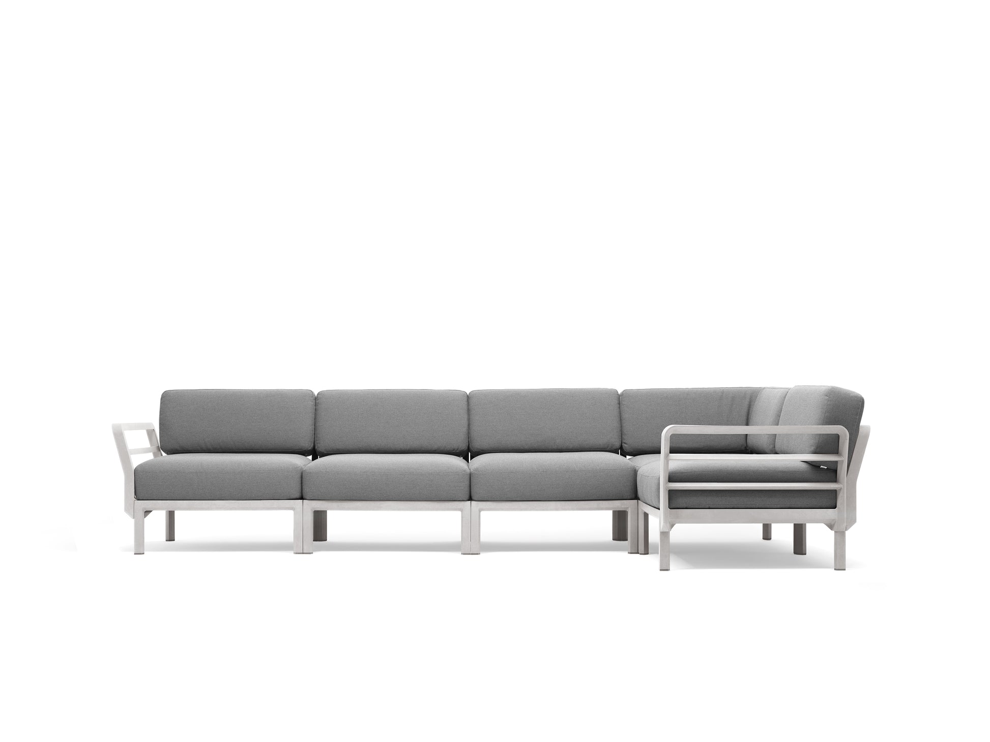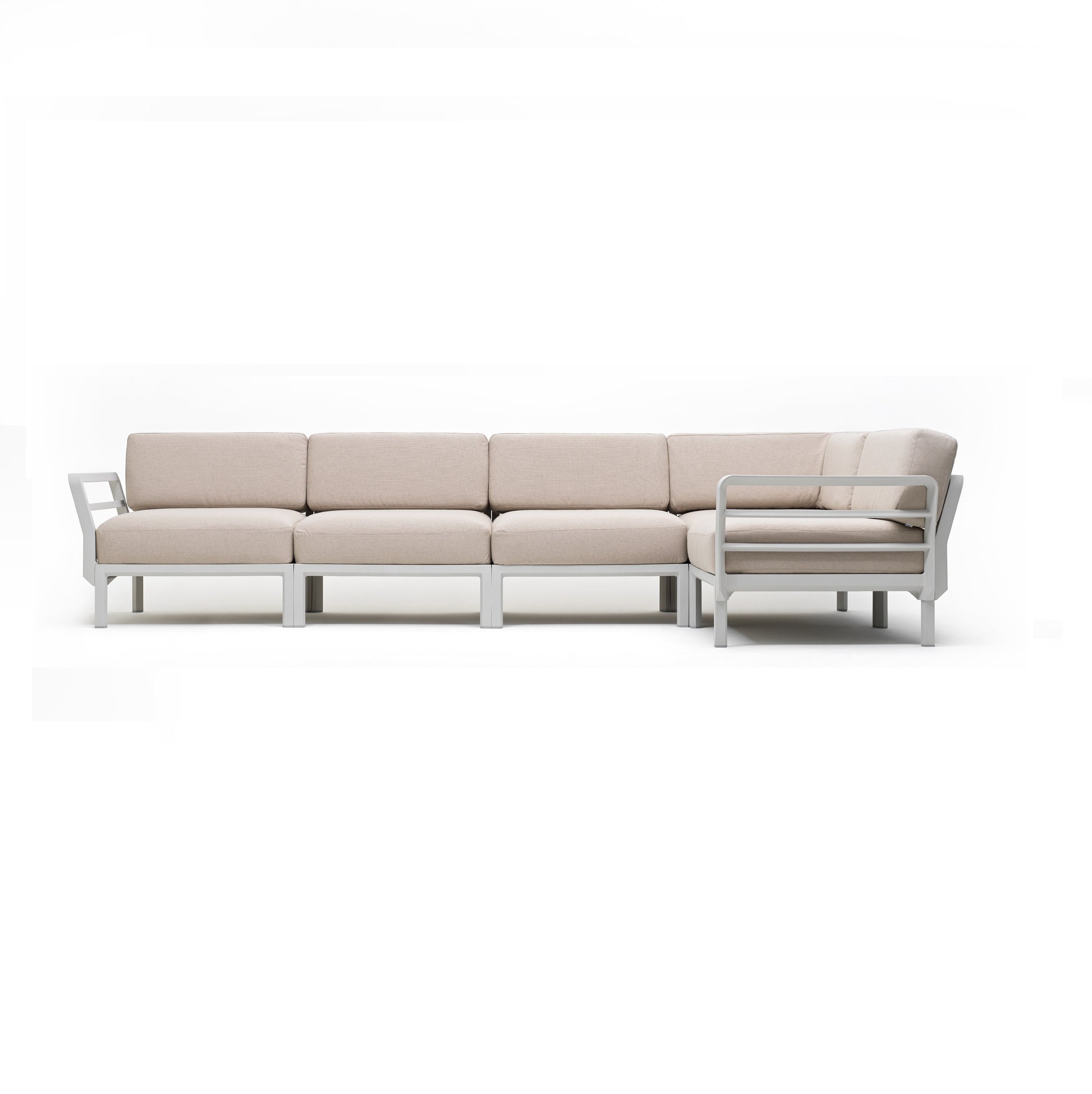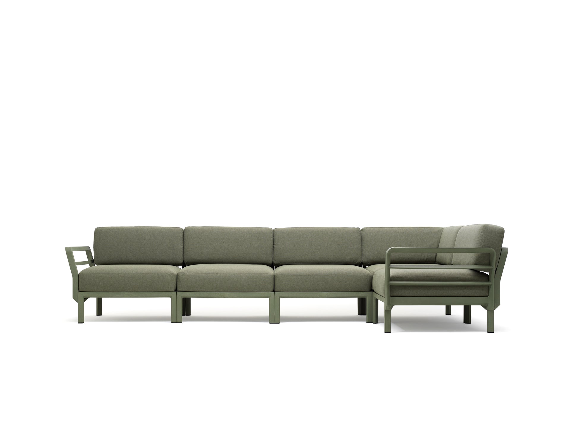 Kárpitozott, moduláris ülésrendszer. A készlet 5 ülést és 8 háttámlát tartalmaz. A keret üvegszálas polipropilén, amely teljesen UV álló, így éveken át megőrzi kiváló minőségét. A háttámla és a kartámaszok az ülőfelület minden oldalára felszerelhetőek. Matt kivitelben, csúszásgátló lábakkal. Újrahasznosítható műanyagból.