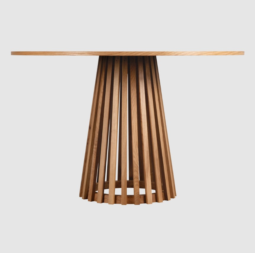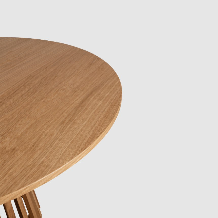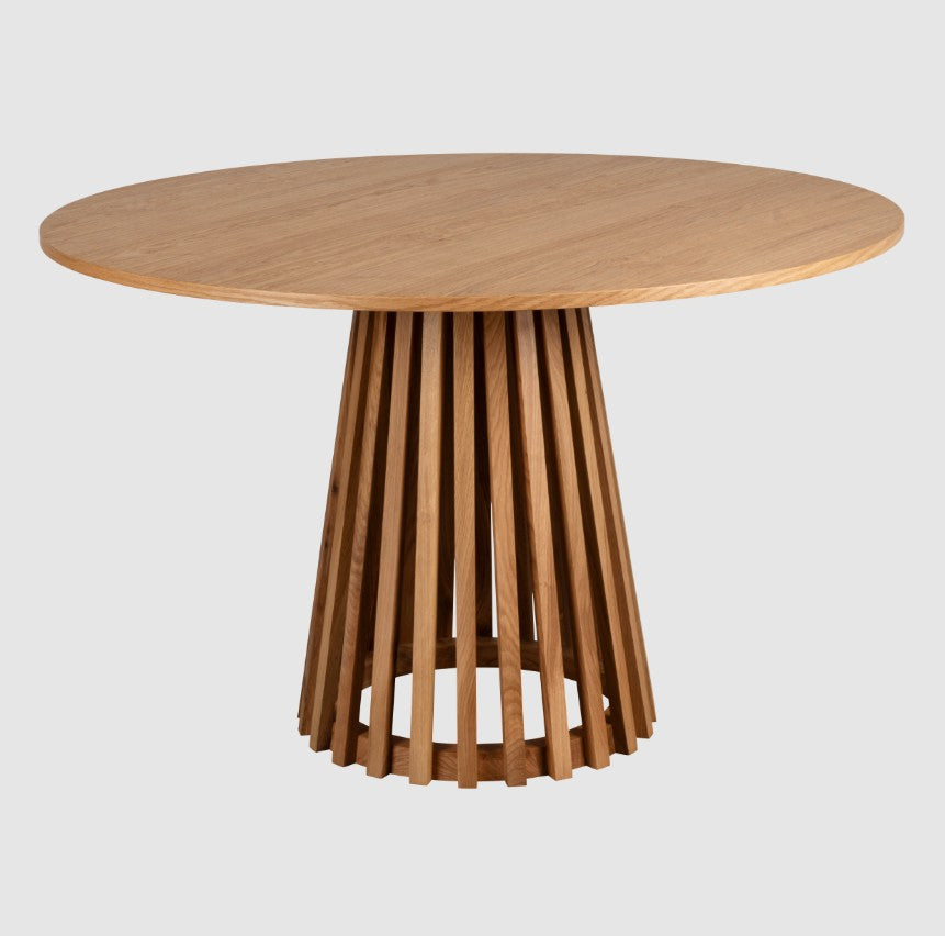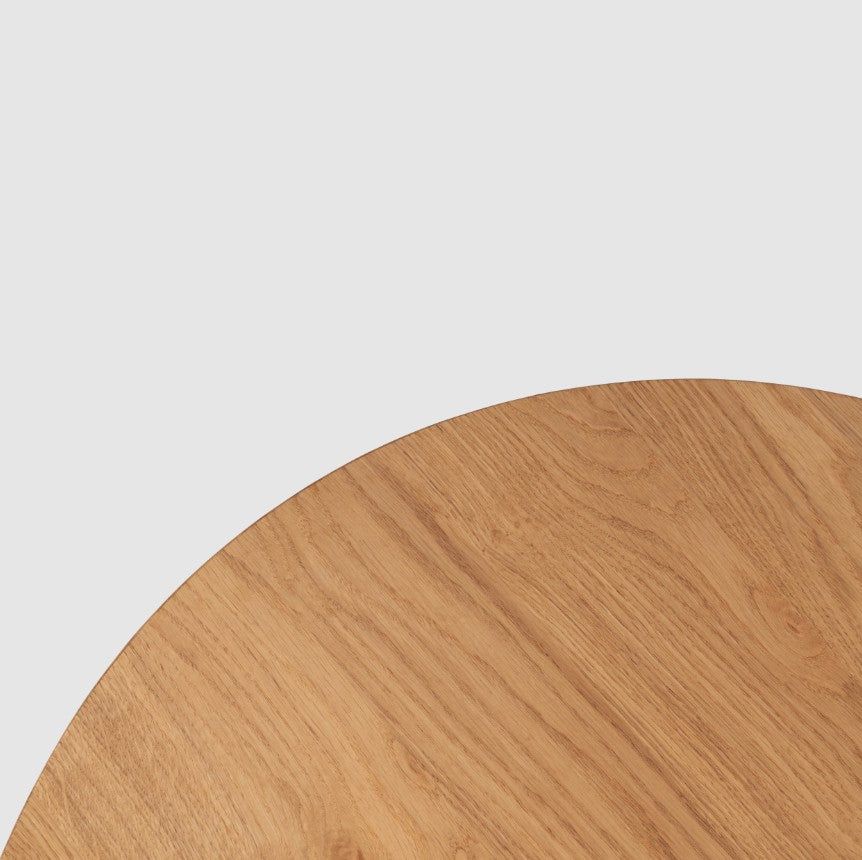 Az asztal strapabíró tölgy furnér anyagból készült, amely hosszú élettartamot és stabil szerkezetet biztosít. Méretei: magassága 76 cm, átmérője 120 cm ideális kisebb helyiségekbe is, ahol helytakarékos megoldásra van szükség. Kialakítása egyszerű, mégis figyelemfelkeltő, amely modern esztétikát kölcsönöz a belső térnek.